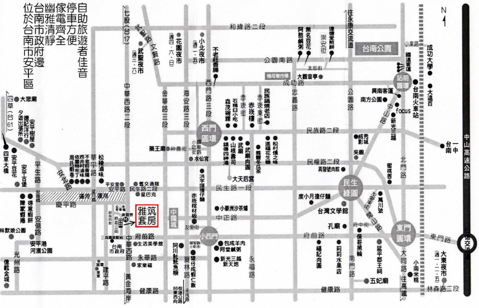 安平老街, 安平古堡, 海安路夜景, 台南運河, 孔廟, 延平郡王祠, 赤崁樓, 花園夜市, 武聖夜市,台南火車站都在10分鐘內就到.